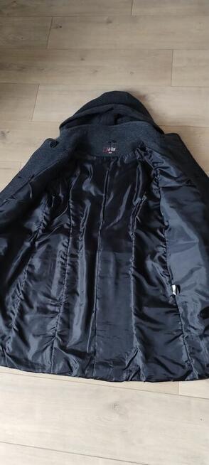 Elegancki, ciepły płaszcz damski wełniany w kolorze ciemnoszarym. Rozmiar z metki 46 (3XL) Odpinany kaptur Materiał ...